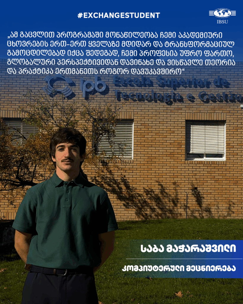 გაიცანით #IBSU-ს ინგლისურენოვანი კომპიუტერული მეცნიერების პროგრამის მე-3 კურსის სტუდენტი, საბა მაჭარაშვილი, რომელიც Erasmus+ გაცვლითი პროგრამით ერთი სემესტრი სწავლას აგრძელებს ორმაგი დიპლომის პროგრამით – ბრაგანცას პოლიტექნიკურ ინსტიტუტში, პორტუგალია.