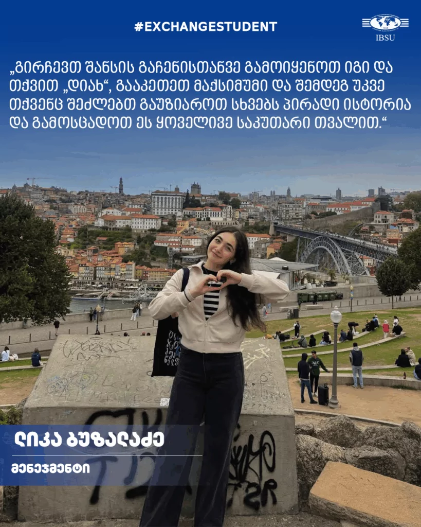 გაიცანით #IBSU-ს მენეჯმენტის საბაკალავრო პროგრამის სტუდენტი, ლიკა ბუზალაძე, რომელიც Erasmus+ გაცვლითი პროგრამით ერთი სემესტრი სწავლას აგრძელებს ISAG European Business School-ში, პორტუგალია. “Erasmus+ გაცვლითი პროგრამის ფარგლებში ერთ სემესტრს პორტოში, პორტუგალიაში ვატარებ და ვსწავლობ ISAG Europ...